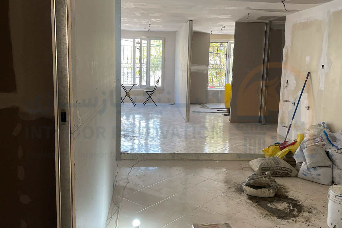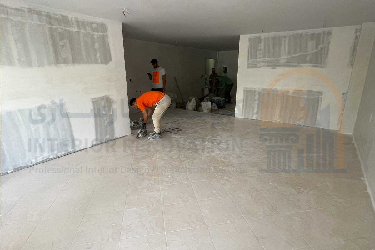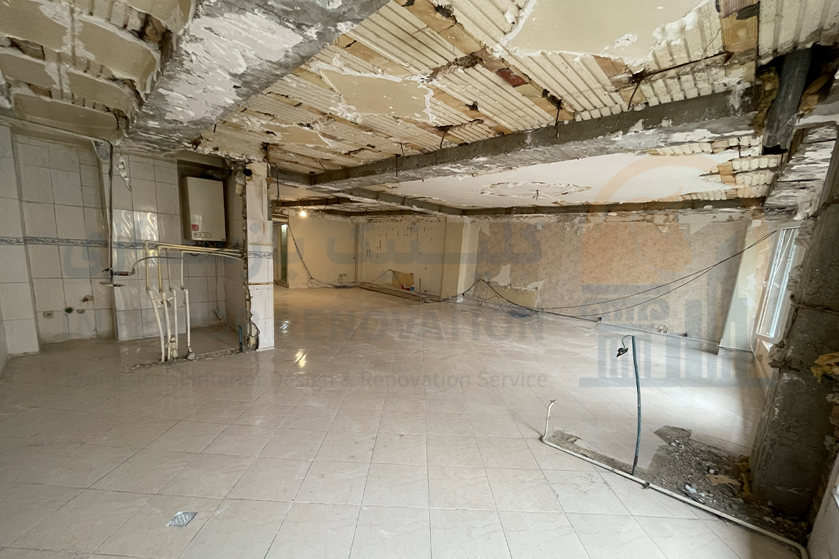 اولین گام در خلق یک فضای نو، حذف عناصر قدیمی و ناکارآمد بود. در این مرحله پس از بازدید اولیه و برداشت دقیق پلان، عملیات تخریب دیوارهای غیرباربر و جمع‌آوری تاسیسات فرسوده با رعایت کامل اصول ایمنی انجام شد تا بستر کار برای طرح جدید آماده شود.